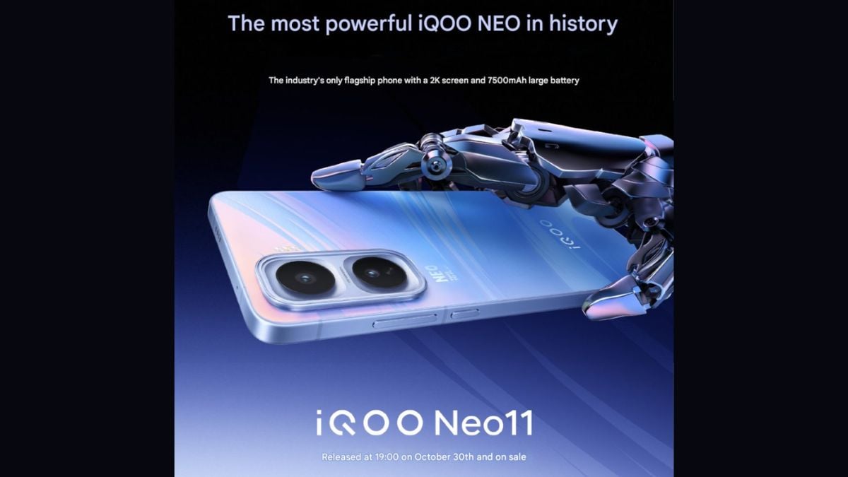 ഐക്യൂ നിയോ 11 ഒക്ടോബർ 30-ന് പ്രാദേശിക സമയം വൈകുന്നേരം 7 മണിക്ക് (ഇന്ത്യൻ സമയം വൈകുന്നേരം 4:30) ചൈനയിൽ ലോഞ്ച് ചെയ്യുമെന്ന് ഐക്യൂ പ്രഖ്യാപിച്ചു. 2K റെസല്യൂഷനോടു കൂടിയ ഡിസ്പ്ലേ ഈ ഹാൻഡ്സെറ്റിൽ ഉണ്ടാകുമെന്ന് കമ്പനി സ്ഥിരീകരിച്ചിട്ടുണ്ട്. 7,500mAh ബാറ്ററിയാണ് ഐക്യൂ നിയോ 11-ന് കരുത്ത് പകരുന്നത്. 2K ഡിസ്പ്ലേയും 7,500mAh ബാറ്ററിയുമുള്ള ഇൻഡസ്ട്രിയിലെ ഒരേയൊരു ഫ്ലാഗ്ഷിപ്പ് സ്മാർട്ട്ഫോണാണ് ഐക്യൂ നിയോ 11 എന്നു കമ്പനി അവകാശപ്പെടുന്നു.